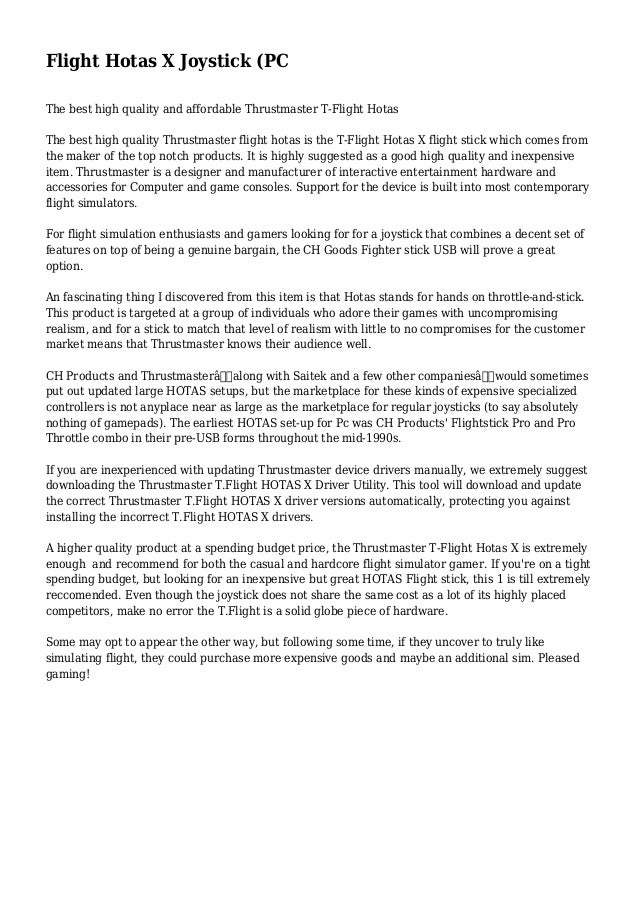 HOTAS Warthog Flight Stick;. Entirely programmable for PC and PS3!. Thrustmaster T.Flight Hotas X Joystick Driver 09 Version 2 Windows Vista 64 bit Thrustmaster T.Flight Hotas X Joystick Driver 16.FDD.1.
