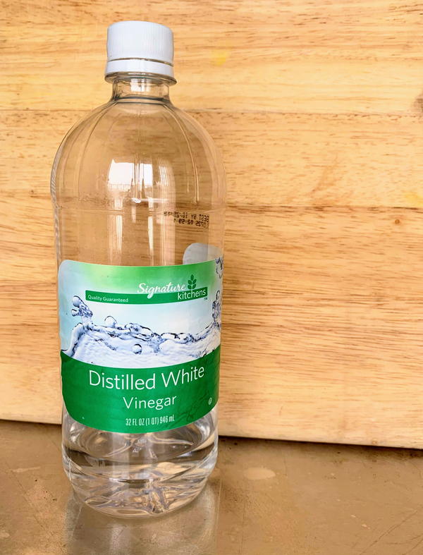 White distilled vinegar is the clear liquid that you will find in lots of different sizes of bottles in the grocery store. Discover our ultimate guide of vinegar uses around the home. You can also try using cleaning vinegar alone on a sponge, paper towel, or rag, but be sure to wear gloves because it can be very irritating to skin and nails.